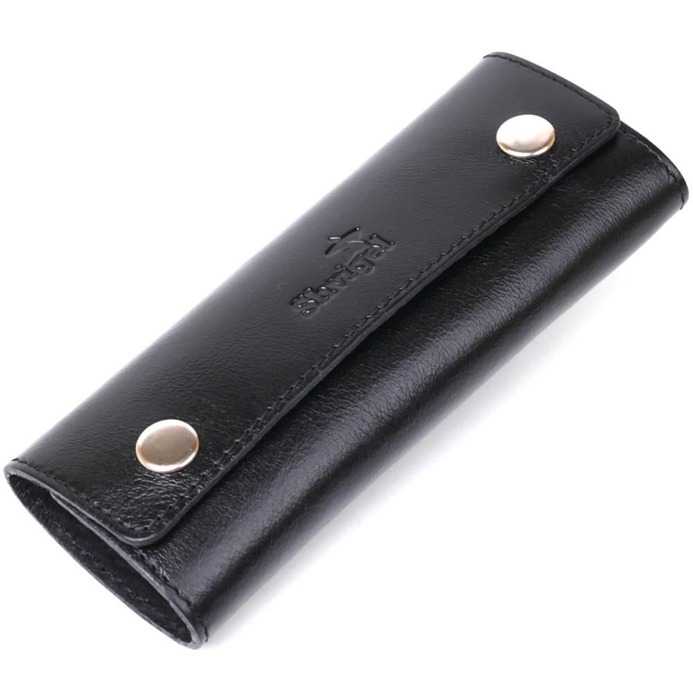 Добротная ключница из натуральной кожи от украинского производителя с отличными характеристиками износоустойчивости. Цвет изделия – универсальный черный с легким блеском, фактура – гладкая. Внутри расположены шесть небольших карабинов для ключей. Закрывается аксессуар на две кнопки в цвете под серебро.