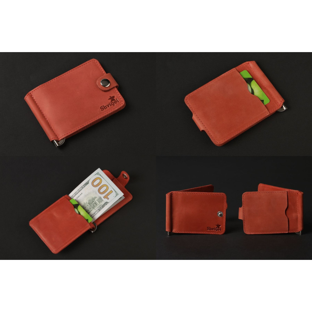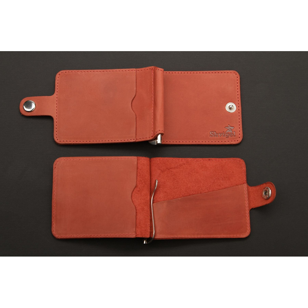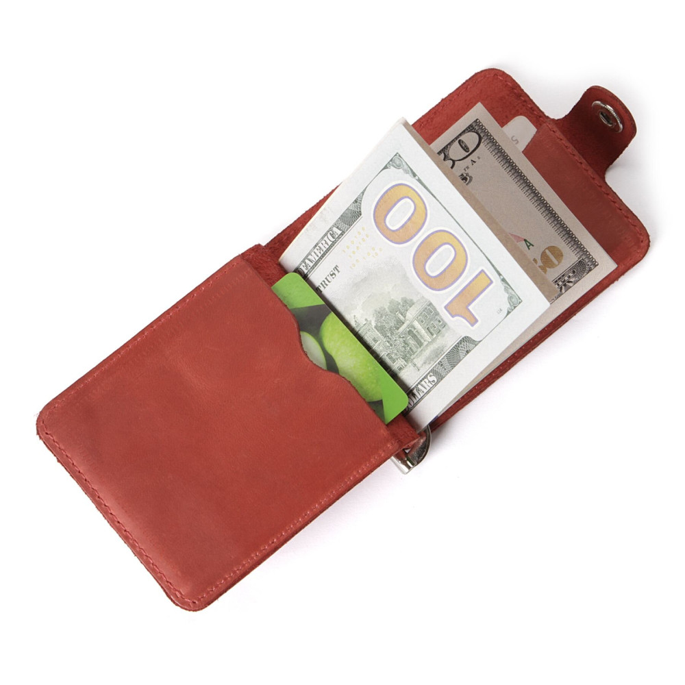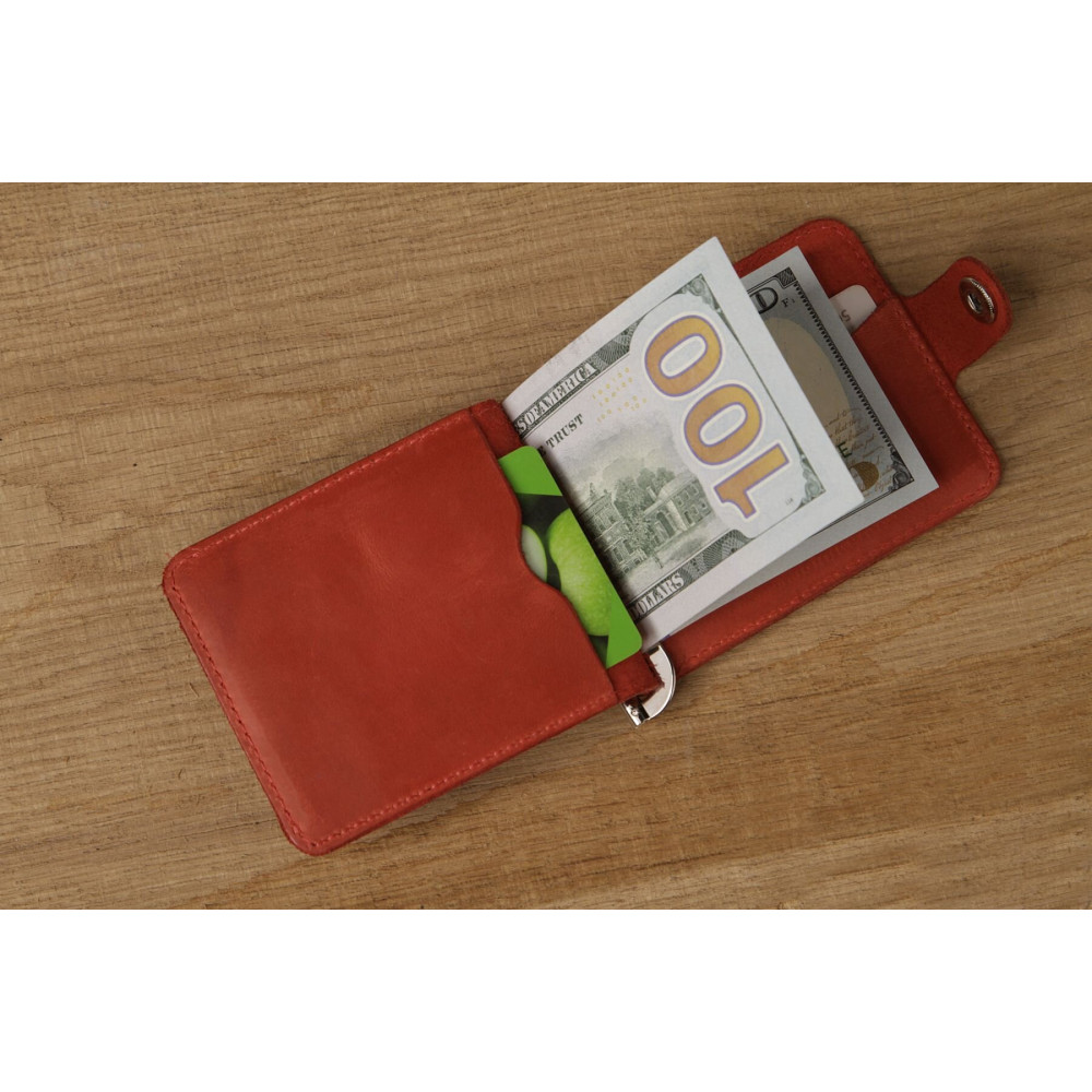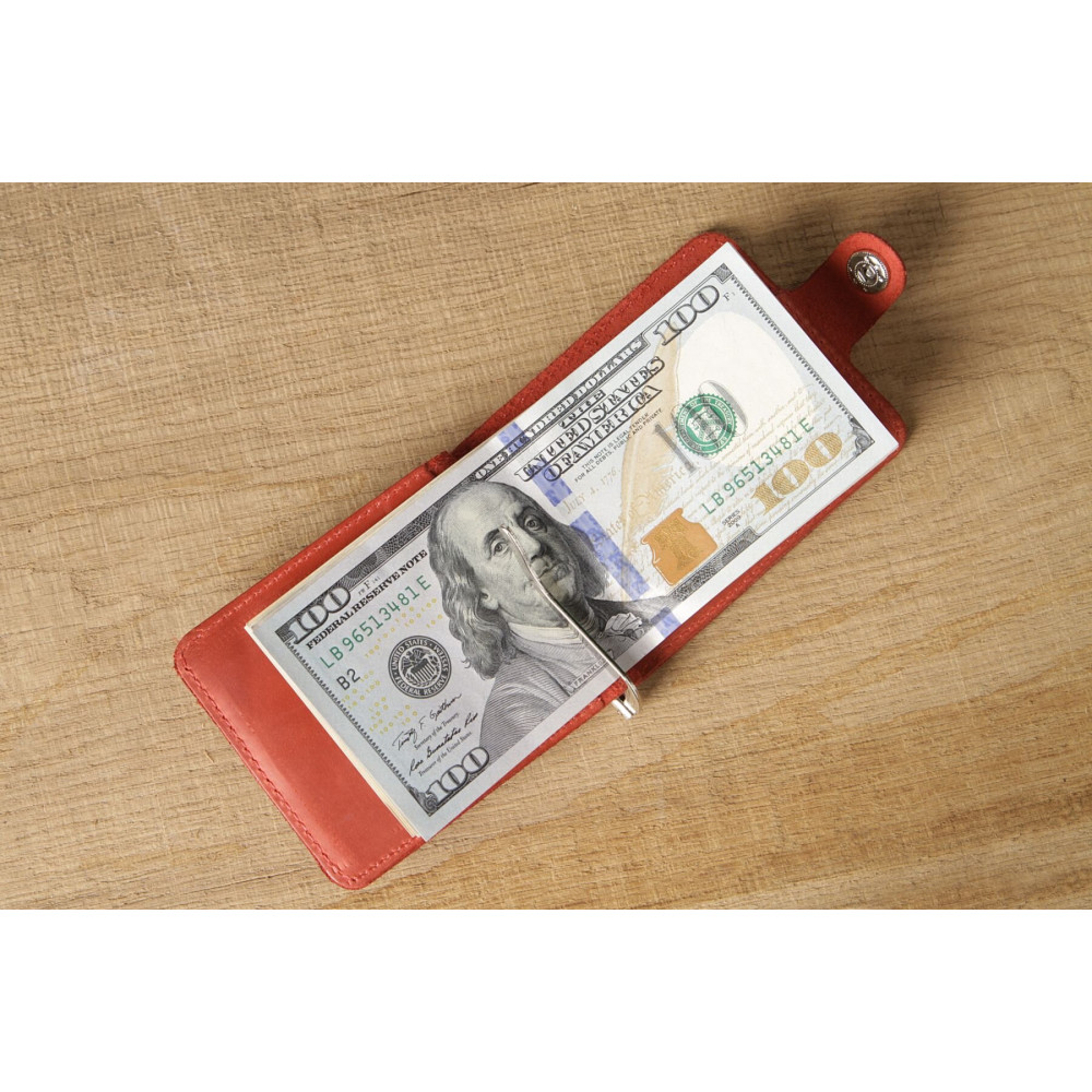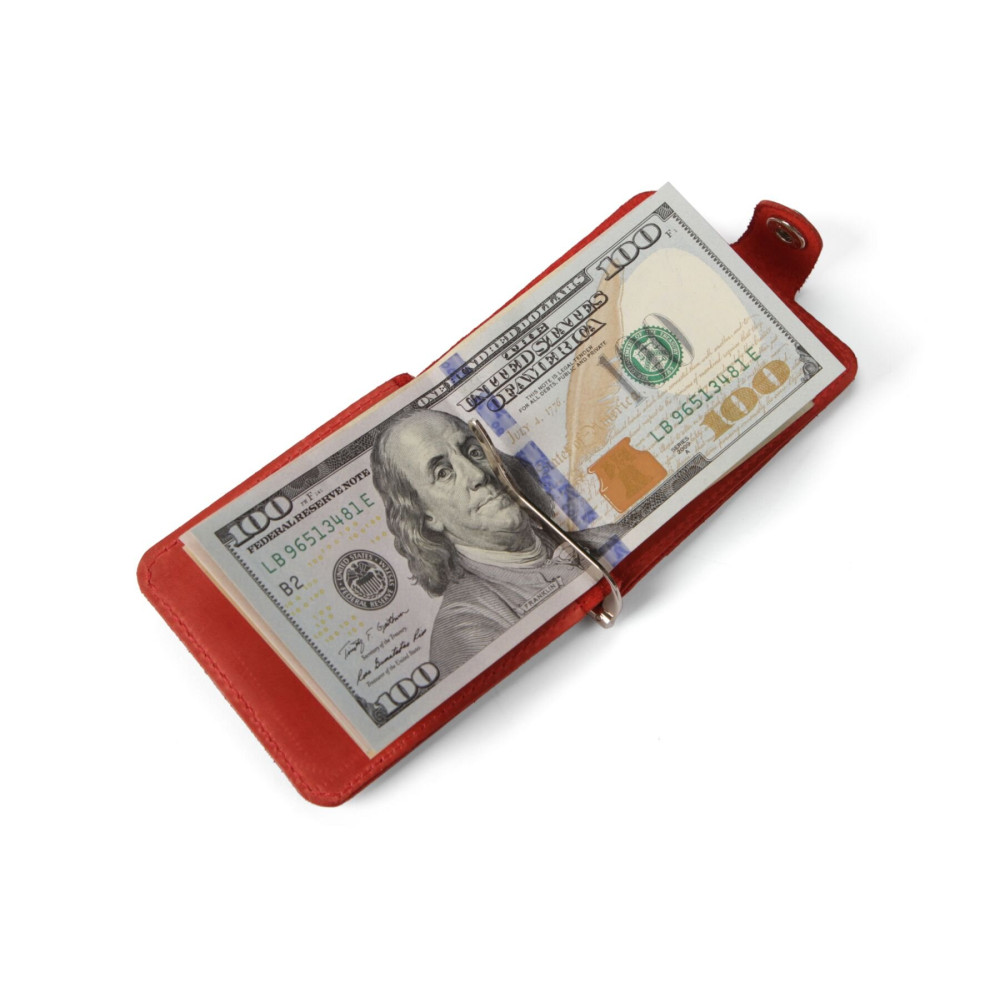 Стильный кожаный зажим красного цвета. Аксессуар выполнен из натуральной высококачественной винтажной кожи. Цвет фурнитуры: серебро. Изделие аккуратно прошито сверхпрочной красной нитью. На задней внешней стороне аксессуара находится карманчик для пластиковых карточек. Зажим упакован в фирменный текстильный пылезащитный чехол.