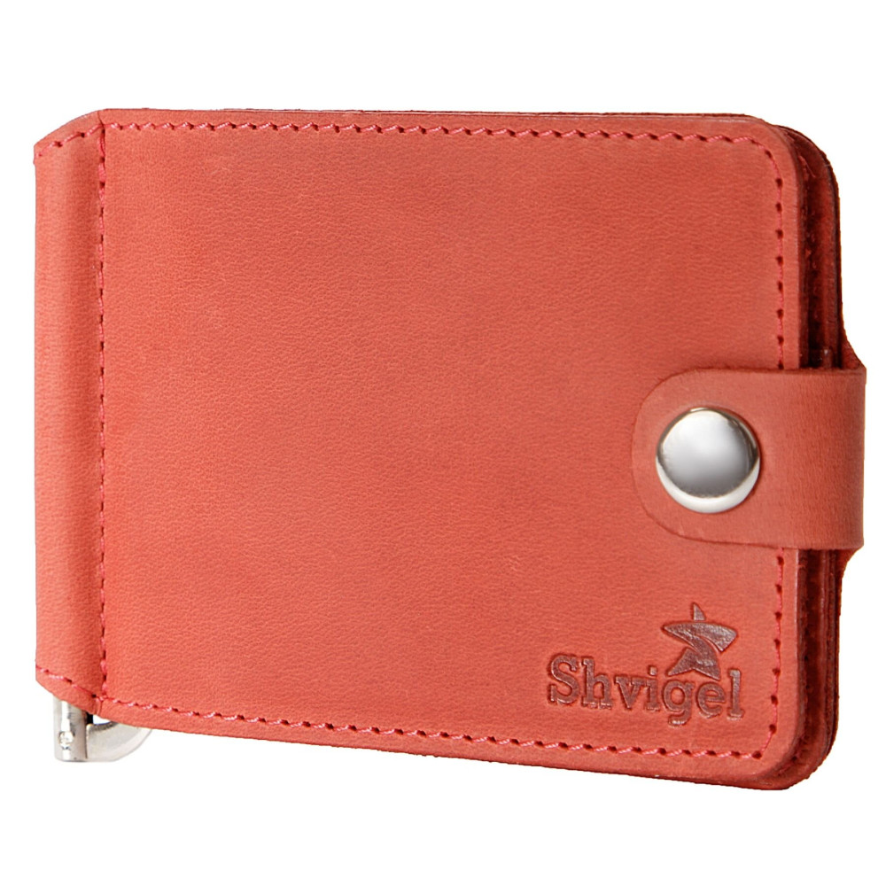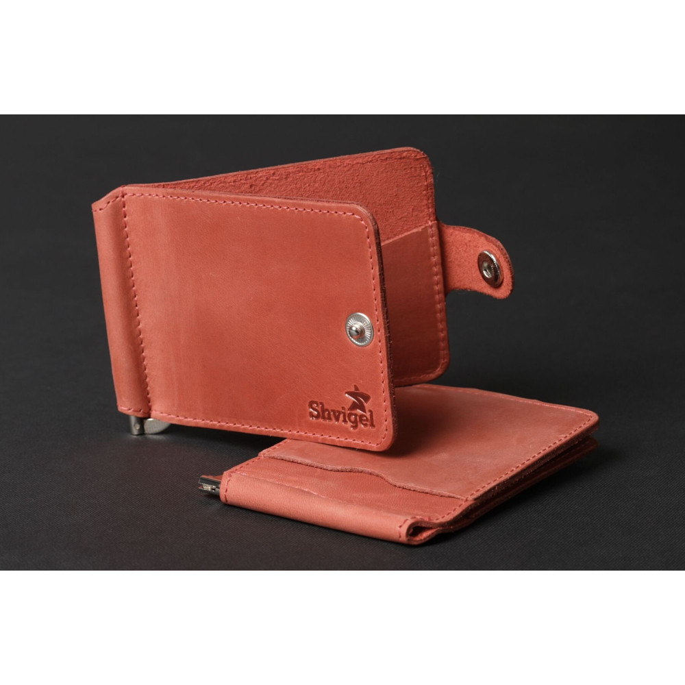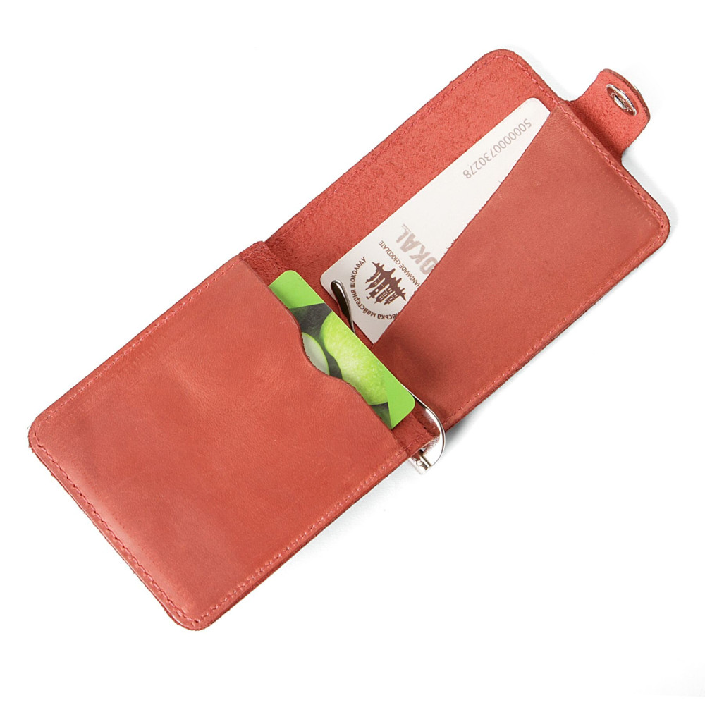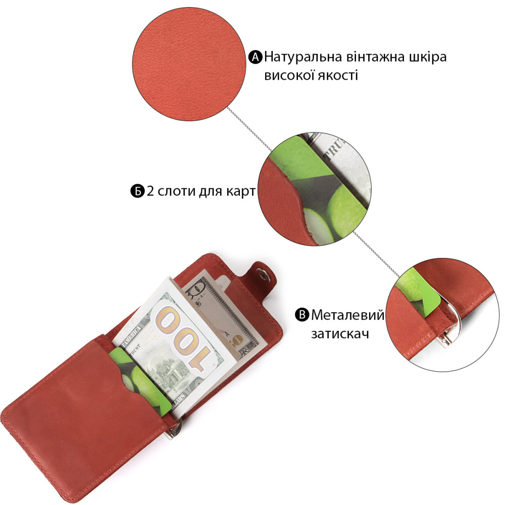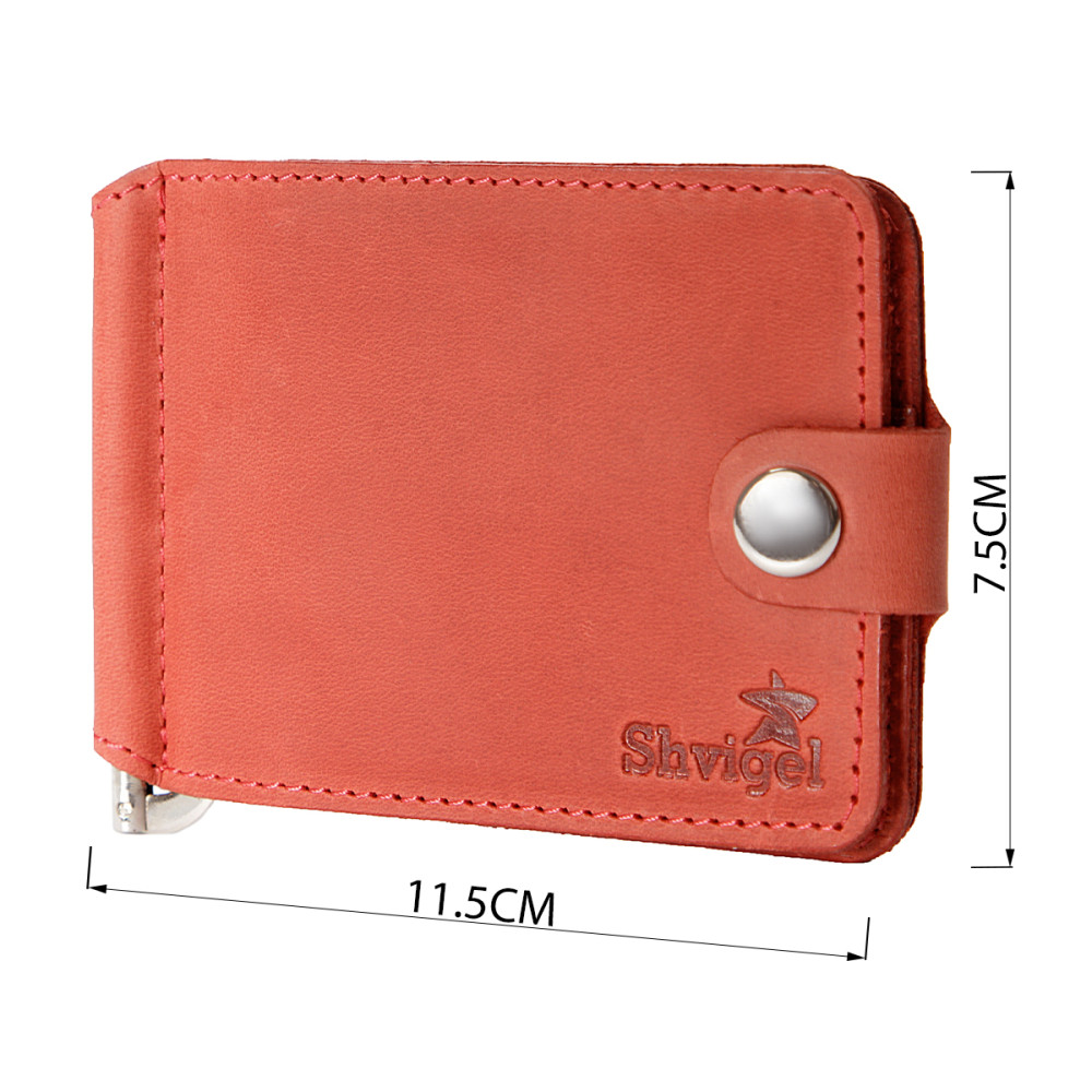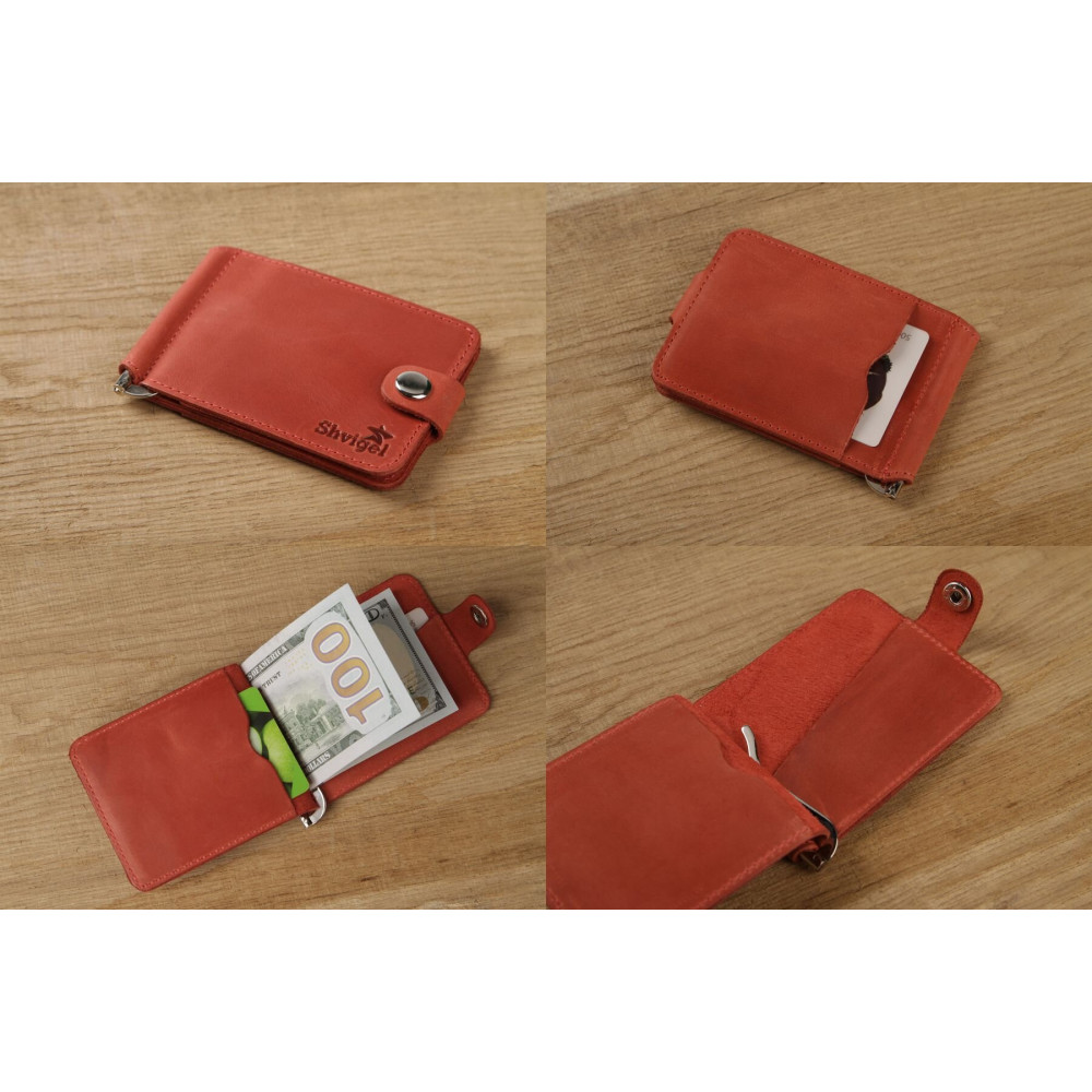 Стильный кожаный зажим красного цвета. Аксессуар выполнен из натуральной высококачественной винтажной кожи. Цвет фурнитуры: серебро. Изделие аккуратно прошито сверхпрочной красной нитью. На задней внешней стороне аксессуара находится карманчик для пластиковых карточек. Зажим упакован в фирменный текстильный пылезащитный чехол.