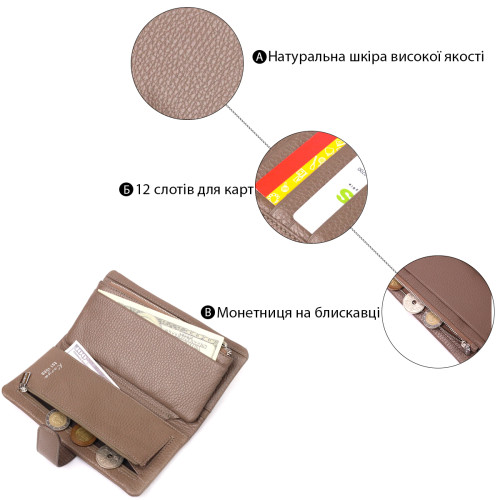 Стильный кошелек из натуральной зернистой кожи, в красивом бежевом цвете. Внутренний разворот состоит из четырех открытых отделений для купюр, одного кармана с расширителем на застежке, одного скрытого кармана на молнии, одного кармана-перегородки на молнии, одного сетчатого карманчика и двенадцати секций для пластиковых карт. Складывается аксессуар пополам, с фиксацией на хлястик с магнитом. Такой кошелек из натуральной кожи - это идеальный вариант на каждый день для тех, кто ценит качество, удобство и комфорт.