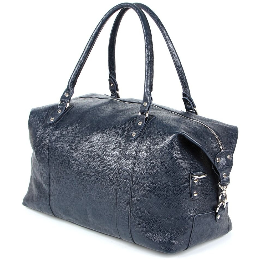 Эксклюзивная дорожная сумка из натуральной кожи с «зернистой» фактурой. Аксессуар выполнен в темно-синем цветовом решении. Цвет фурнитуры: серебро. Вместительности такой сумки будет достаточно для похода в спортзал или недлительной командировки. Аксессуар выглядит очень красиво и дорого, поэтому он может быть превосходным решением для подарка. Дно сумки защищено металлическими ножками. Изделие упаковано в текстильный пылезащитный чехол.