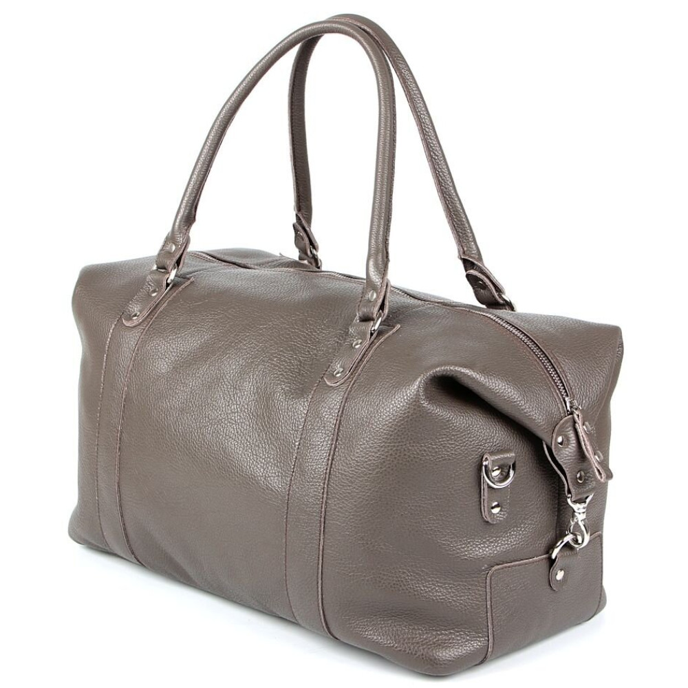 Сверхпрочная дорожная сумка из натуральной высококачественной кожи. Аксессуар выполнен в сером цветовом решении. Цвет фурнитуры: серебро. Дно сумки защищено металлическими ножками. Изделие может быть использовано для недлительного уикенда или похода в спортзал. Аксессуар упакован в текстильный пылезащитный чехол.
