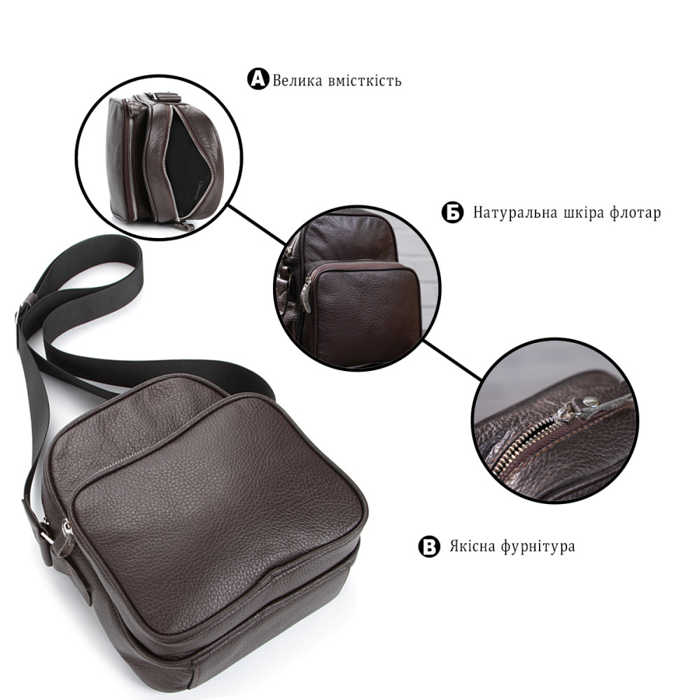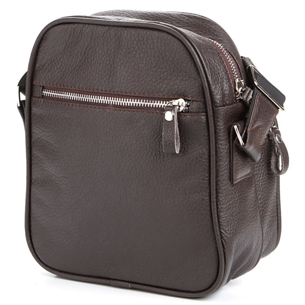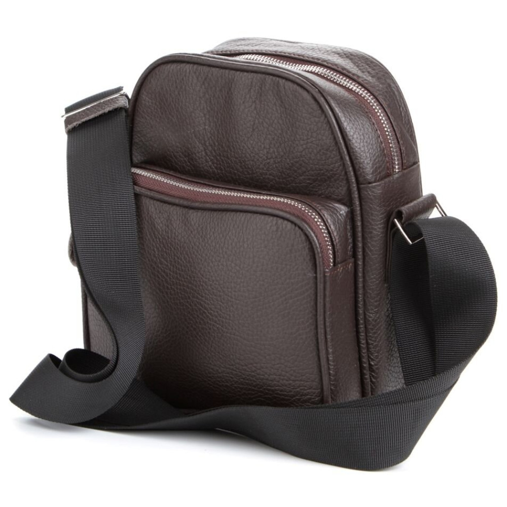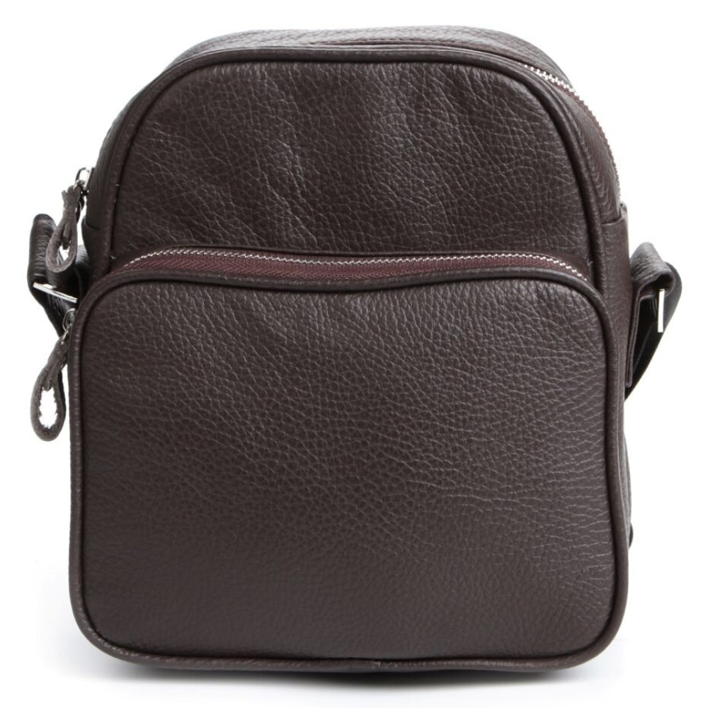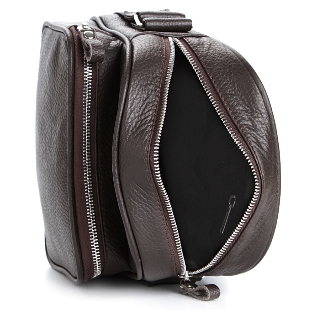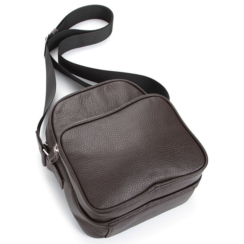 Современная мужская кожаная сумка темно-коричневого цвета. Аксессуар выполнен из кожи флотар, которая отличается «зернистой» фактурой. Цвет фурнитуры: серебро. Сумка носится через плечо при помощи регулируемого плечевого ремня, который выполнен из прочного текстильного материала.