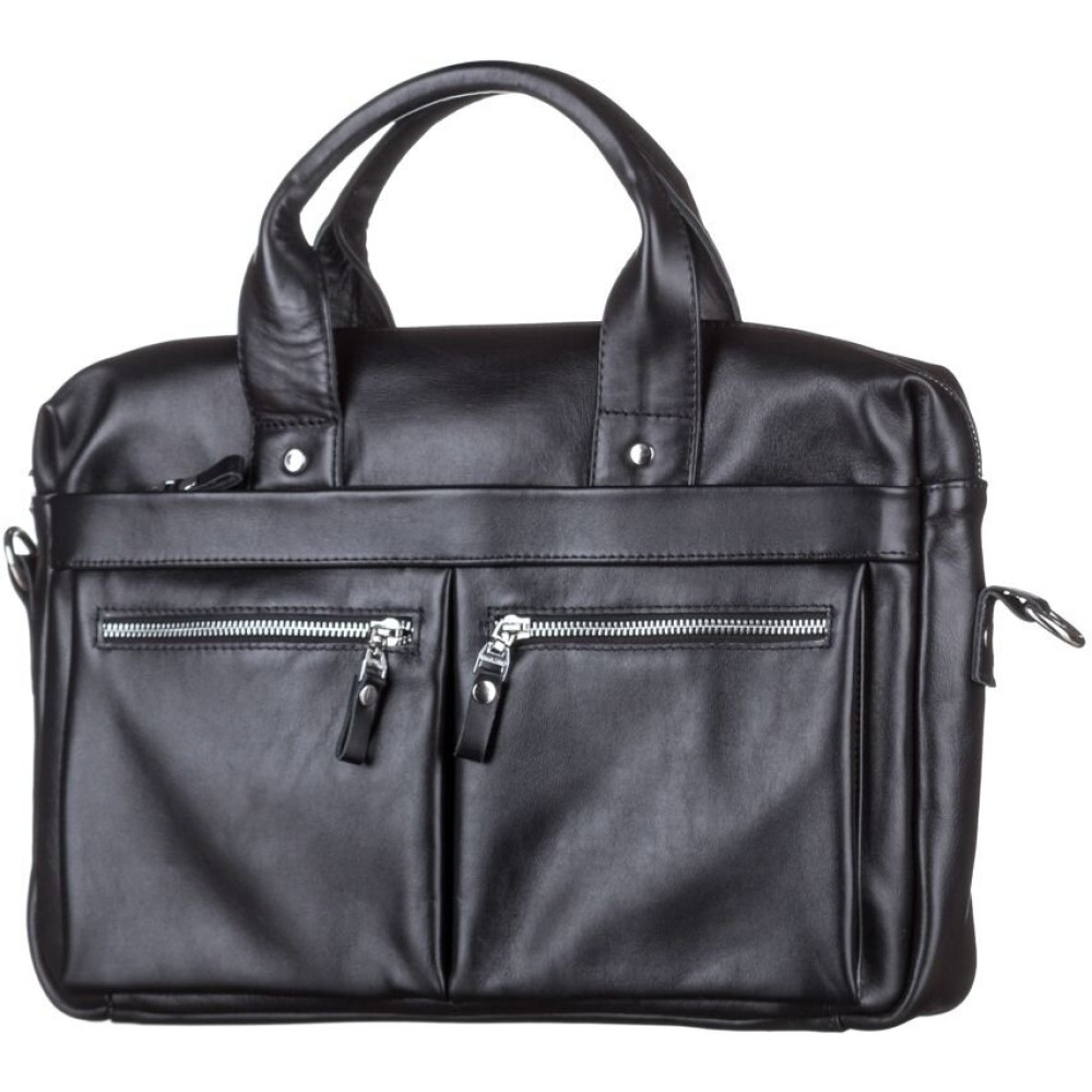 Красивая мужская сумка с отделением для небольшого ноутбука, а также документов формата А4. Аксессуар выполнен из натуральной гладкой кожи черного цвета. На лицевой стороне данного изделия расположены одно отделение и два кармана на металлических молниях. На задней внешней стороне находится еще одно отделение на молнии. Сумку можно переносить в руке при помощи удобных кожаных ручек, а также через плечо (в комплекте съемный, регулируемый плечевой ремень, который выполнен в комбинации текстильного материала и натуральной кожи). Цвет фурнитуры: серебро.