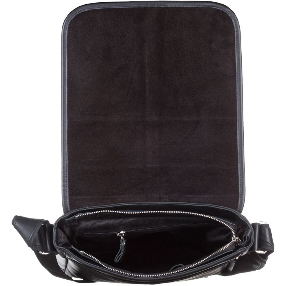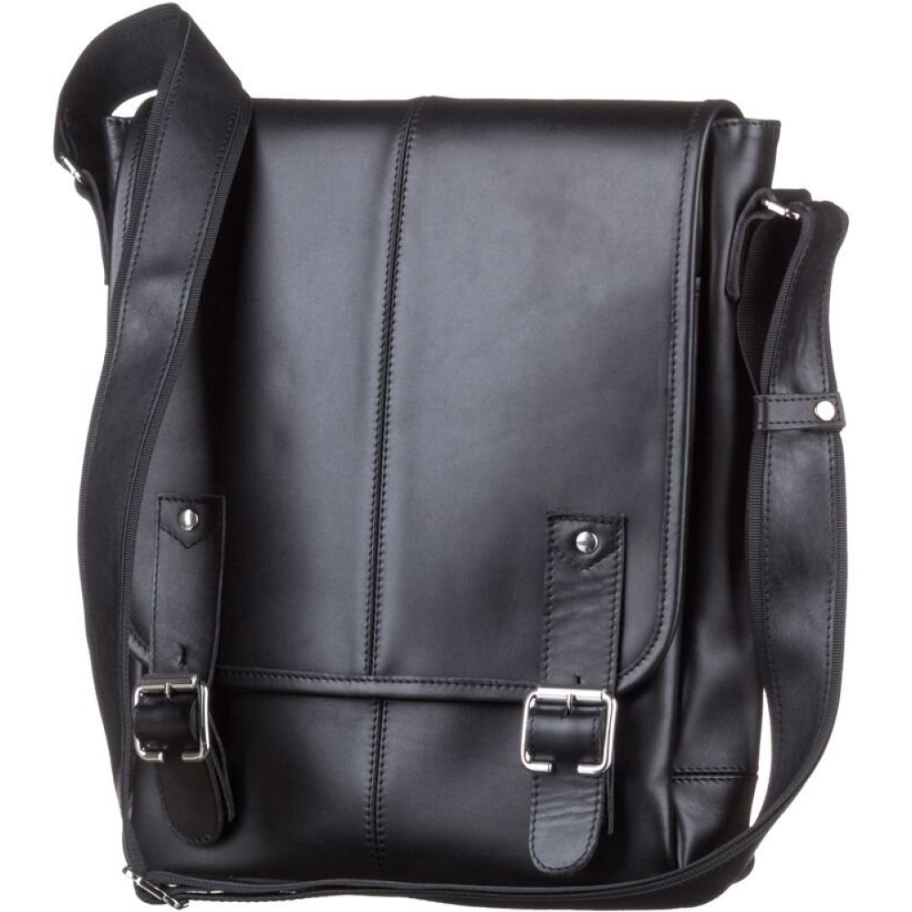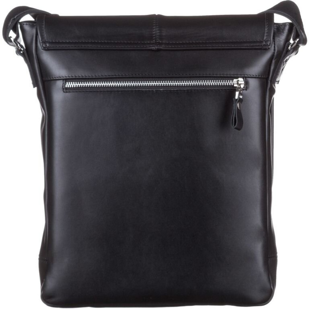 Удобная кожаная мужская сумка высокого качества. Изделие выполнено из кожи черного цвета. Кожа добротная, приятная на ощупь. Цвет фурнитуры: серебро. Сумка аккуратно прошита сверхпрочной нитью черного цвета. На задней внешней стороне аксессуара расположено отделение на молнии. Данная модель носиться через плечо. Плечевой ремень выполнен в комбинации натуральной кожи и прочного текстильного материала. Сумка закрывается при помощи клапана и 2-х кожаных хлястиков на магнитных кнопках, а также молнией. Под клапаном находится вместительный накладной карман. Подкладка выполнена из прочного текстильного материала черного цвета.
