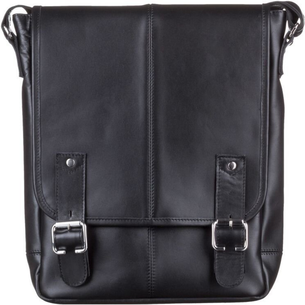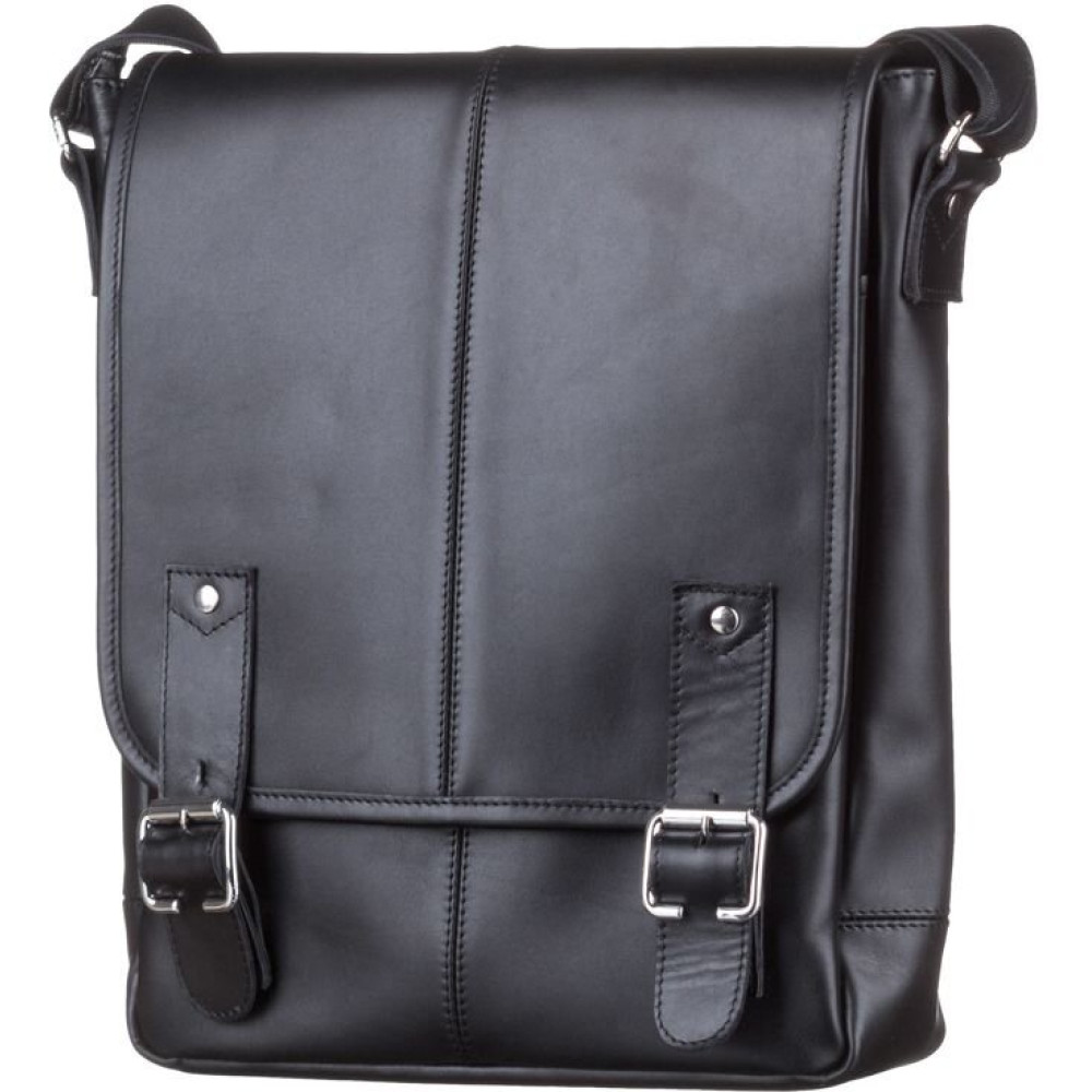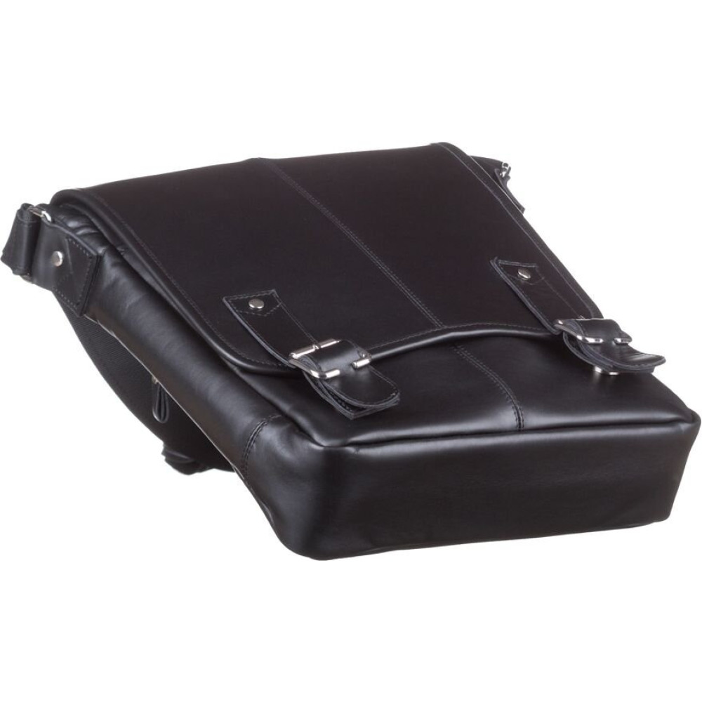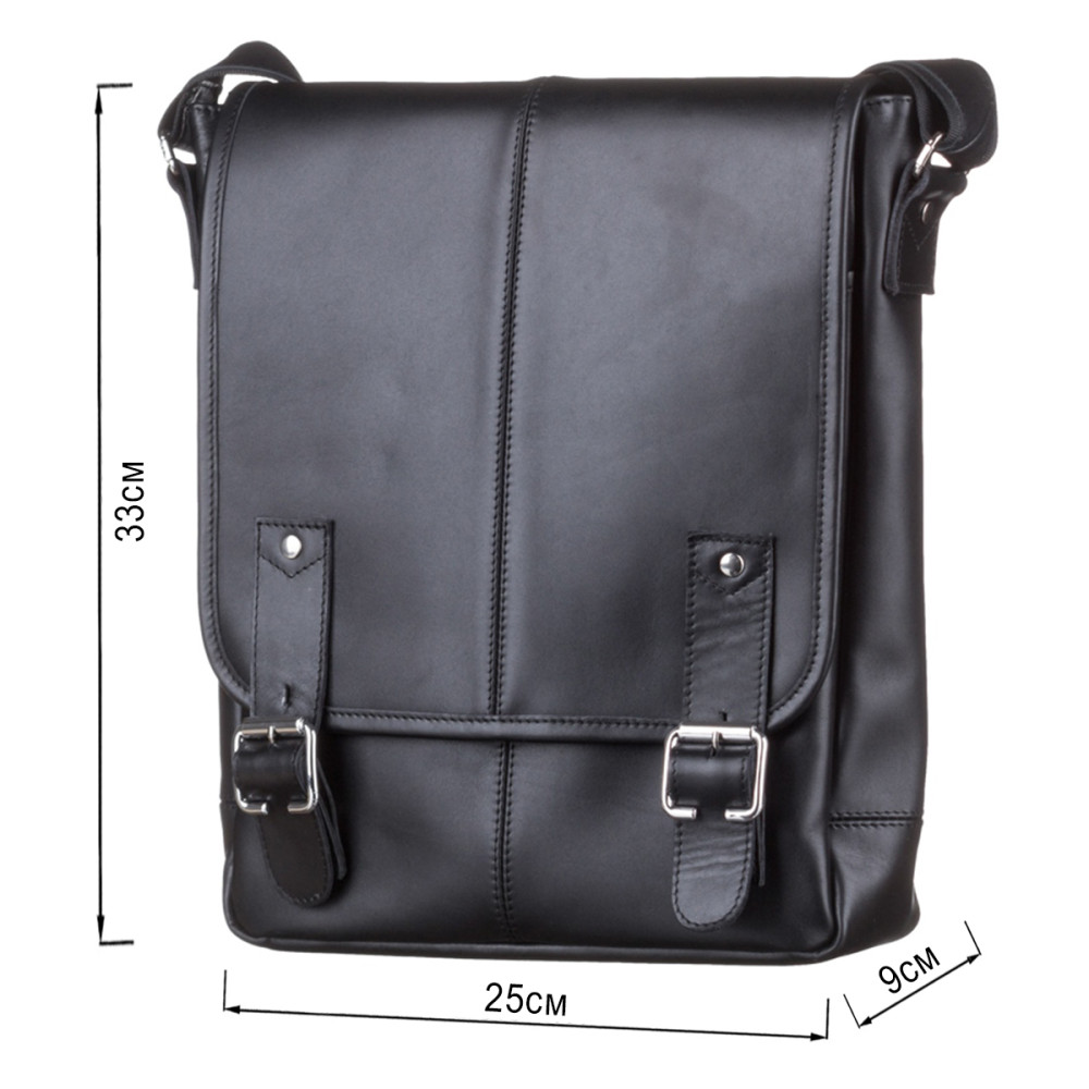 Удобная кожаная мужская сумка высокого качества. Изделие выполнено из кожи черного цвета. Кожа добротная, приятная на ощупь. Цвет фурнитуры: серебро. Сумка аккуратно прошита сверхпрочной нитью черного цвета. На задней внешней стороне аксессуара расположено отделение на молнии. Данная модель носиться через плечо. Плечевой ремень выполнен в комбинации натуральной кожи и прочного текстильного материала. Сумка закрывается при помощи клапана и 2-х кожаных хлястиков на магнитных кнопках, а также молнией. Под клапаном находится вместительный накладной карман. Подкладка выполнена из прочного текстильного материала черного цвета.