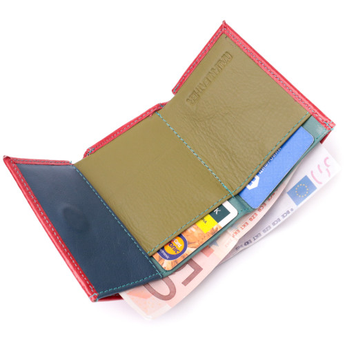Ультрамодне жіноче портмоне в три складання з натуральної шкіри найвищої якості. Акцентом цього гаманця є колір, точніше кілька кольорів – він червоного кольору зовні та багатобарвний усередині. Аксесуар складається з двох містких відділень для купюр, двох осередків для карток та кишені для монет. Зовні виріб прошитий рівним рядком бірюзового кольору по краю і прикрашений металевим логотипом компанії виробника. Портмоне доповнено надійною фурнітурою та міцною підкладкою. Укомплектований гаманець у фірмову картонну коробку білого кольору.