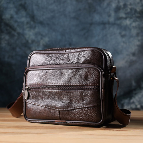 Стильна чоловіча сумка з високоякісної натуральної шкіри, стійка до пошкоджень та зношування. Ефектний та практичний аксесуар з одним основним відділенням та трьома додатковими кишенями для зберігання аксесуарів, телефону та інших дрібниць. Ремінь сумки виконаний із міцного текстилю та регулюється по довжині, що забезпечує зручність при носінні. Благородний коричневий колір моделі робить її універсальною та ідеально придатною як для повсякденного використання, так і для ділових зустрічей. Ця сумка стане чудовим вибором для чоловіка, що цінує комфорт та стиль у кожній деталі.