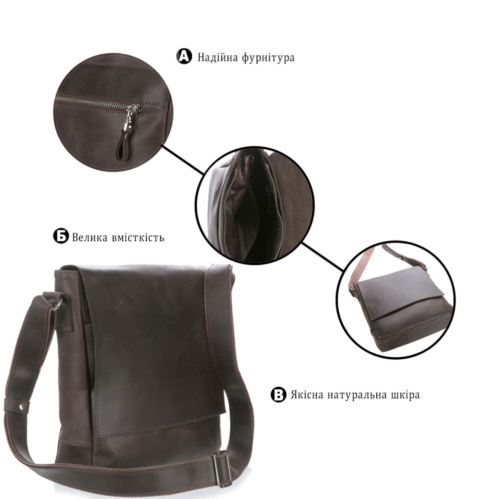 Красива чоловіча сумка вертикального формату з натуральної міцної шкіри. Цим аксесуаром лекго підкреслити свою особливість і неповторність, адже ця сумка виконана за допомогою ручної роботи і є ексклюзивним виробом. Крім іншого, аксесуар стійкий до пошкоджень і потертостей, тому дуже довго не втрачає новизни зовнішнього вигляду.