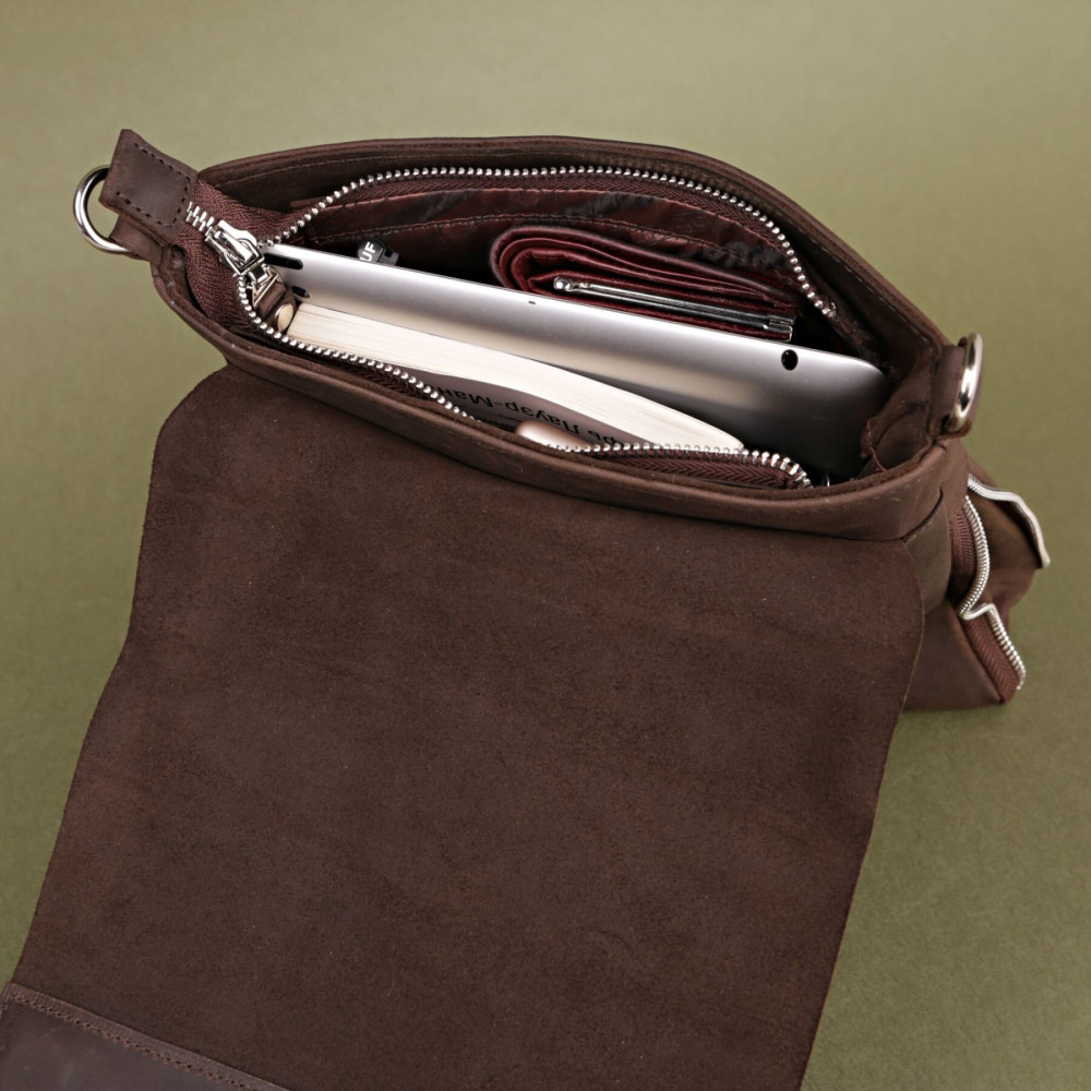 Основне відділення закривається блискавкою, всередині на передній стінці, є шкіряна накладна кишеня для габаритного мобільного телефону. На задній стінці - потаємна, вмістка кишеня на блискавці.