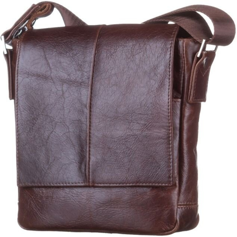 Невелика чоловіча шкіряна сумка через плече українського виробництва. Виріб виконаний з гладкої шкіри, високої якості. Колір фурнітури: срібло. Аксесуар закривається за допомогою клапана на двох прихованих магнітах і металевою блискавкою. Під клапаном розташована накладна кишеня. На задній зовнішній стороні даного аксесуара знаходиться відділення на металевій блискавці. Сумка носитися через плече за допомогою регульованого текстильного плечового ременя. Відмінне рішення для подарунка чоловікові будь-якого віку.